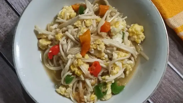10. Sajikan tumis jamur enoki dengan telur saat masih hangat.